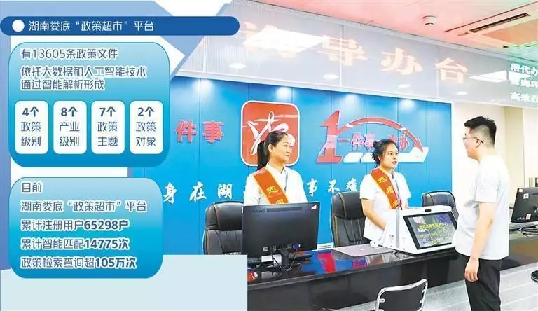 ”婁底市發(fā)展和改革委員會黨組成員、副主任劉曉方介紹,針對政策不好找、信息不對稱等問題,“政策超市”聯(lián)合人工智能團隊,設(shè)置政策智能引擎和智能客服,設(shè)置線上窗口和線下解讀,為企業(yè)提供處處可問、時時可詢立體式服務(wù)渠道,“不僅如此,還依托大數(shù)據(jù)和人工智能技術(shù),將政策精準推送至企業(yè),變政策‘被動兌付’為‘精準投放’。